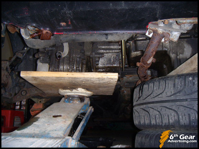 Next use the floorjack and position it under the tranny to take the weight after you unbolt it.